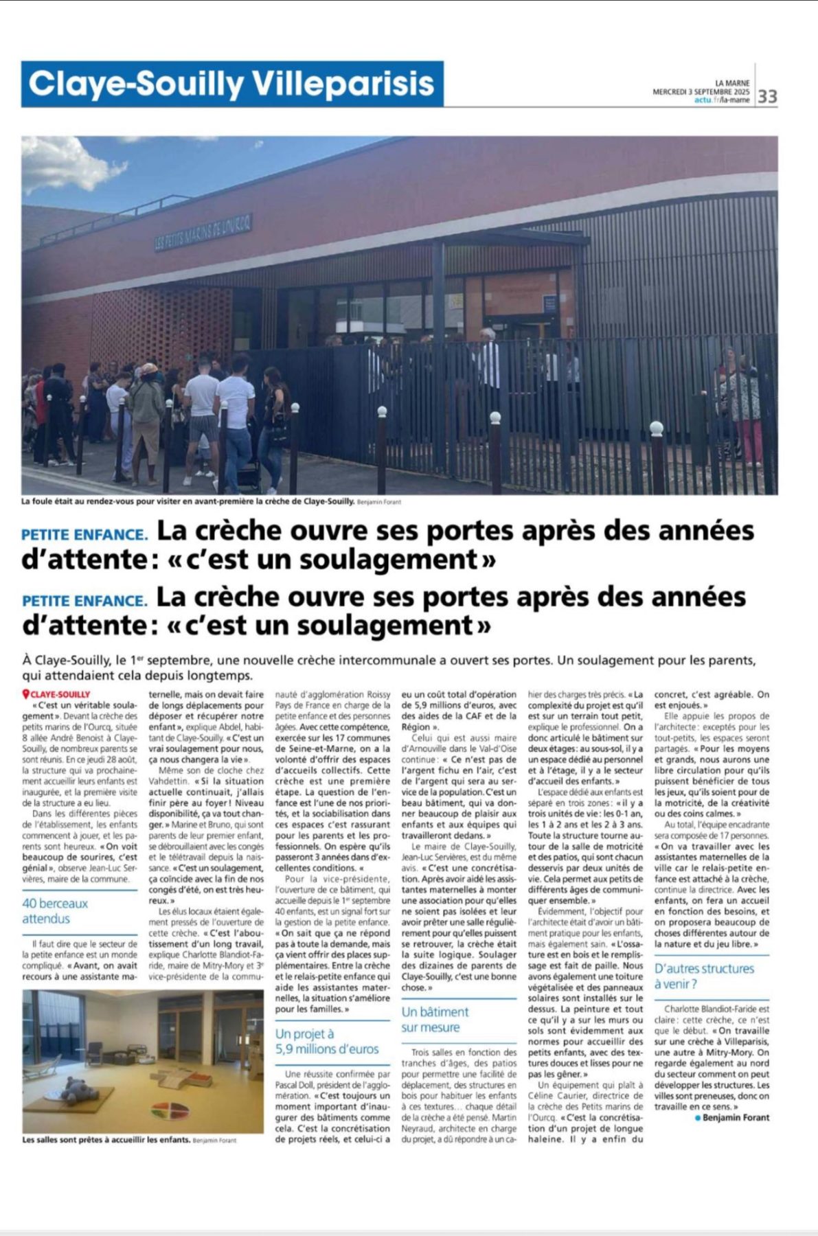 De nombreux parents étaient présents pour découvrir les lieux lors de cette première visite, marquant la concrétisation d’un projet attendu de longue date. L’événement a également retenu l’attention de la presse locale : un article est paru dans La Marne le mercredi 3 septembre 2025, mettant en lumière l’ouverture de la crèche ainsi que le rôle de l’agence dans la réalisation du projet.